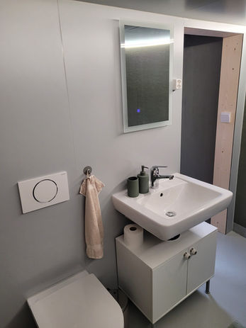 Dusche, WC, Waschbecken, Spiegel (LED), Handtücher / Hausschuhe, Rauchmelder